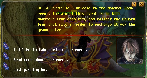 Follow the Orders you are givin and kill monsters 200 of each cronus, 300 of each Misty Marsh, 350 of each Gobi, 400 of each Dark Marsh, 500 of each Island, 550 of each Volcano, 600 of each LostLand or you can do it in Cata After you Kill enough Monsters and have all the keys you will be ported into a map where you click on a big Pumpkin and get a final key right click on it. It will port you in to a Cata map find the Pumkin Lord ,Now Kill the Final Monster Bash Boss Pick your Reward and Start Over can be done as many times as you Like In a Day or take a week to do one round your choice